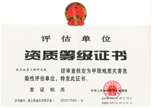 2012年3月2日,經審核、評審、公示、審批程序,國土資源部授予我院地質災害危險性評估甲級資質單位,這是我院依法、嚴謹、科學執業,科技實力全面增強的結果。
