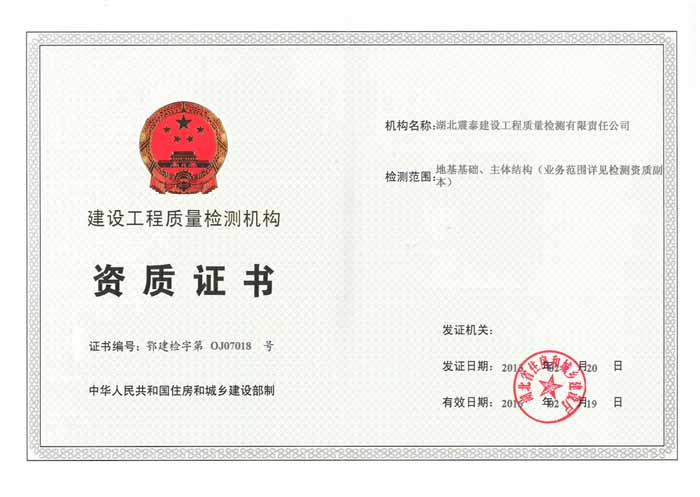 根據《中華人民共和國行政許可法》等法律、法規及有關企業資質管理規定,省住建廳進行了詳細審核,并于2013年2月21日進行了公示(詳見文件《鄂建審告[2013]18號》),批準我單位檢測資質延續,新的資質證書現已領回。