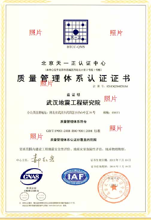 2013年7月9日,武漢地震工程研究院獲得ISO9001質量管理體系認證證書。