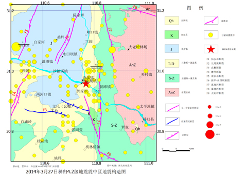 2014年3月27日00時20分,湖北省宜昌市秭歸縣屈原鎮 (北緯30.90度,東經110.84度)發生4.2級地震。震中位于秭歸向斜與黃陵背斜的交匯部位,微構造上在仙女山地塹內。秭歸向斜軸向總體呈近南北向,向斜槽部由上侏羅統蓬萊鎮組成,產狀平緩,傾角10-20°,兩翼由上侏羅統遂寧組—上三疊統沙鎮溪組組成,地層傾角增大到20-30°。黃陵背斜軸向10°左右,核部由早元古宙崆嶺群各類變質巖組成,西翼為震旦系—三疊系,地層傾角25-60°。仙女山地塹主要由仙女山斷裂帶與九灣溪斷裂控制邊界。