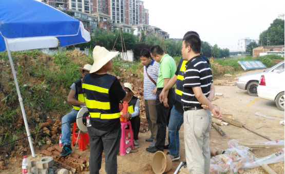 6月13日,黃江院長、羅登貴副院長、馮謙副院長等公司領導冒著烈日親臨地鐵8號線巖溶探測施工現場慰問職工。