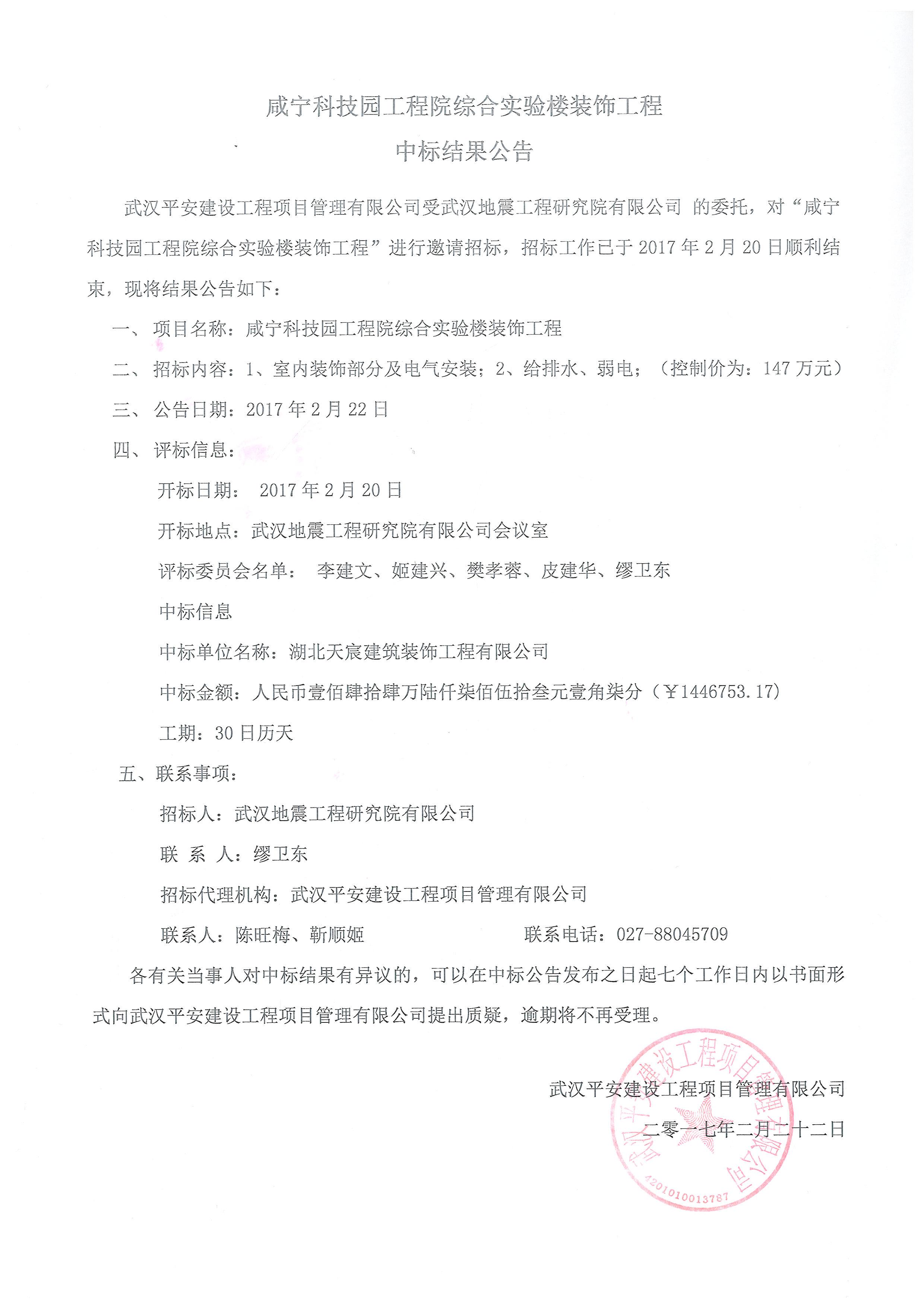 咸寧科技園工程院 綜合實驗樓裝飾工程中標結果公告
