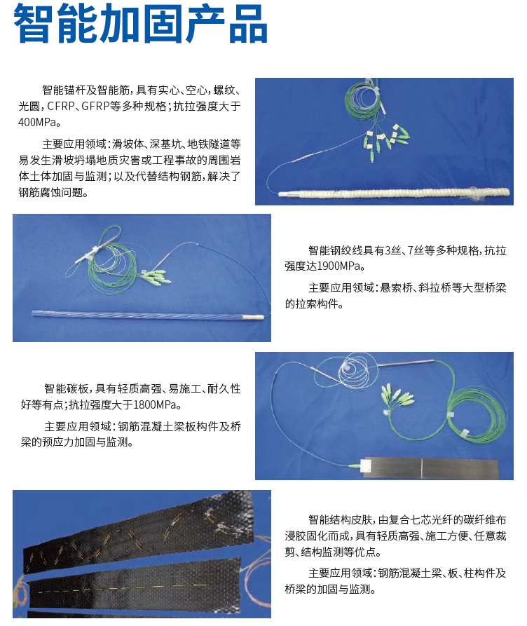此外,加固中心獲授權五項加固新技術、新材料相關的國家專利技術,包括:智能錨桿、智能鋼絞線、智能碳板、智能結構皮膚等。該技術可實現在加固的同時對被加固建筑進行結構安全智能監測:在加固施工后,給出加固后結構狀態數據,并在結構服役期里長期進行遠程監測。相關成果經國家一級查新機構及湖北省土木學會鑒定,達到國際先進和部分國際領先水平,并榮獲湖北省科技進步獎。